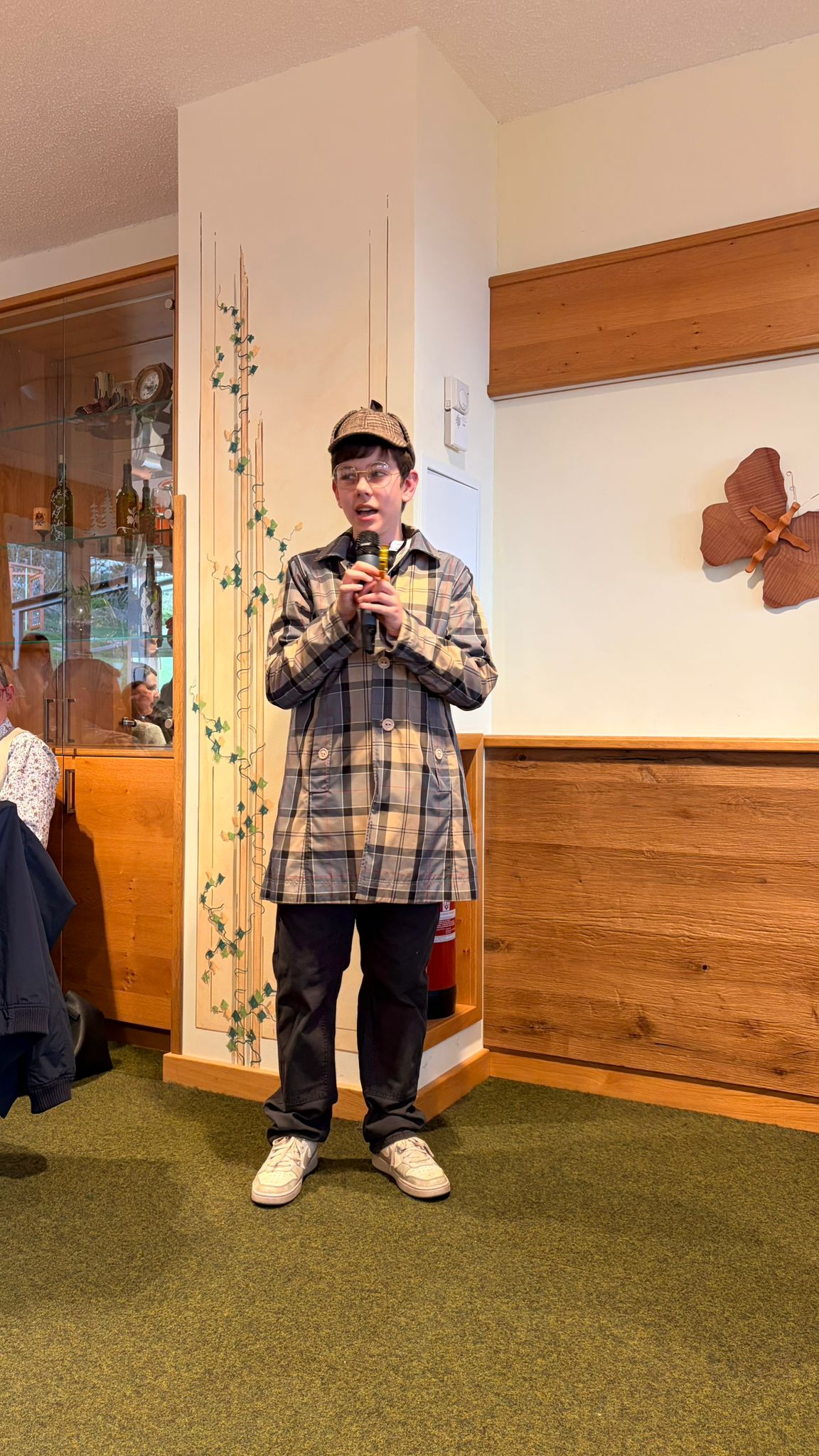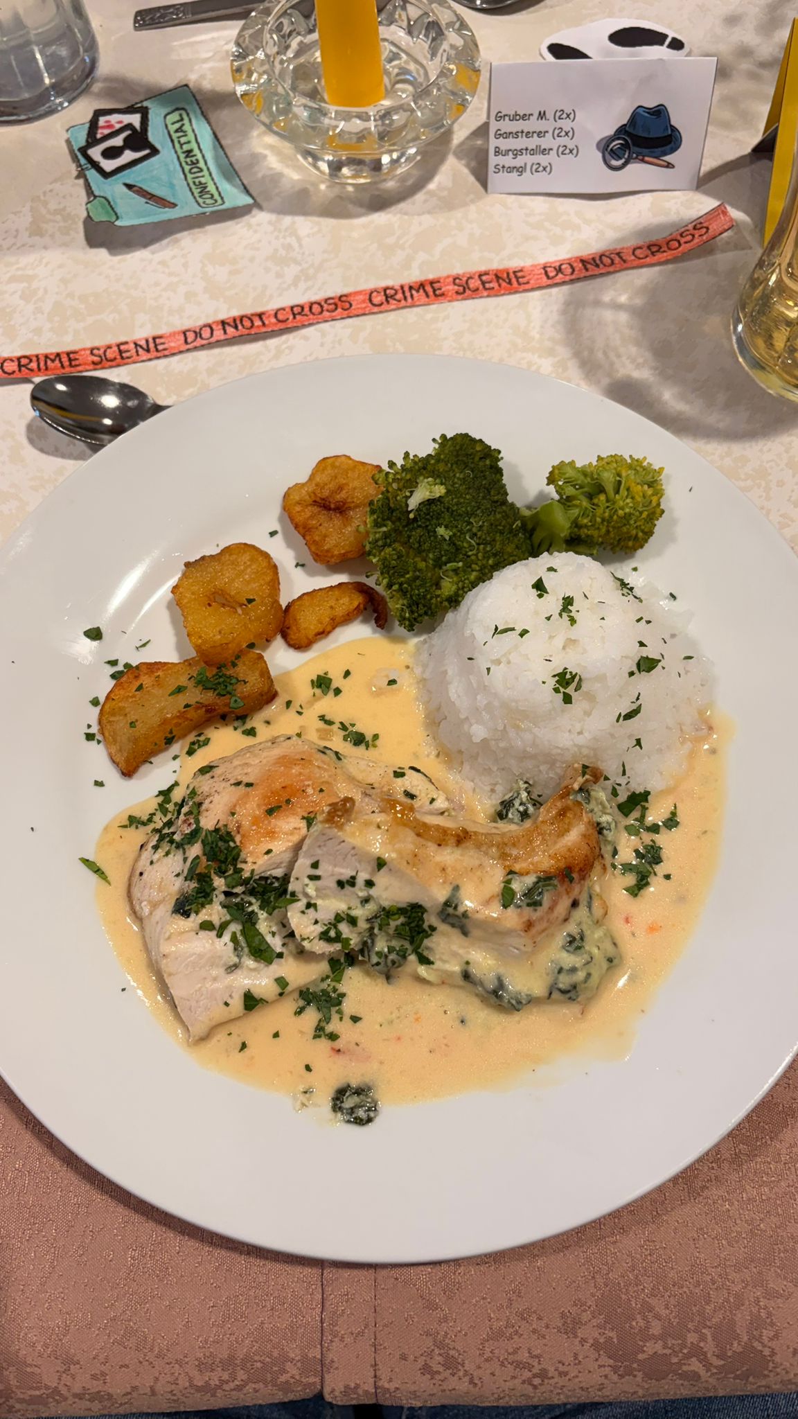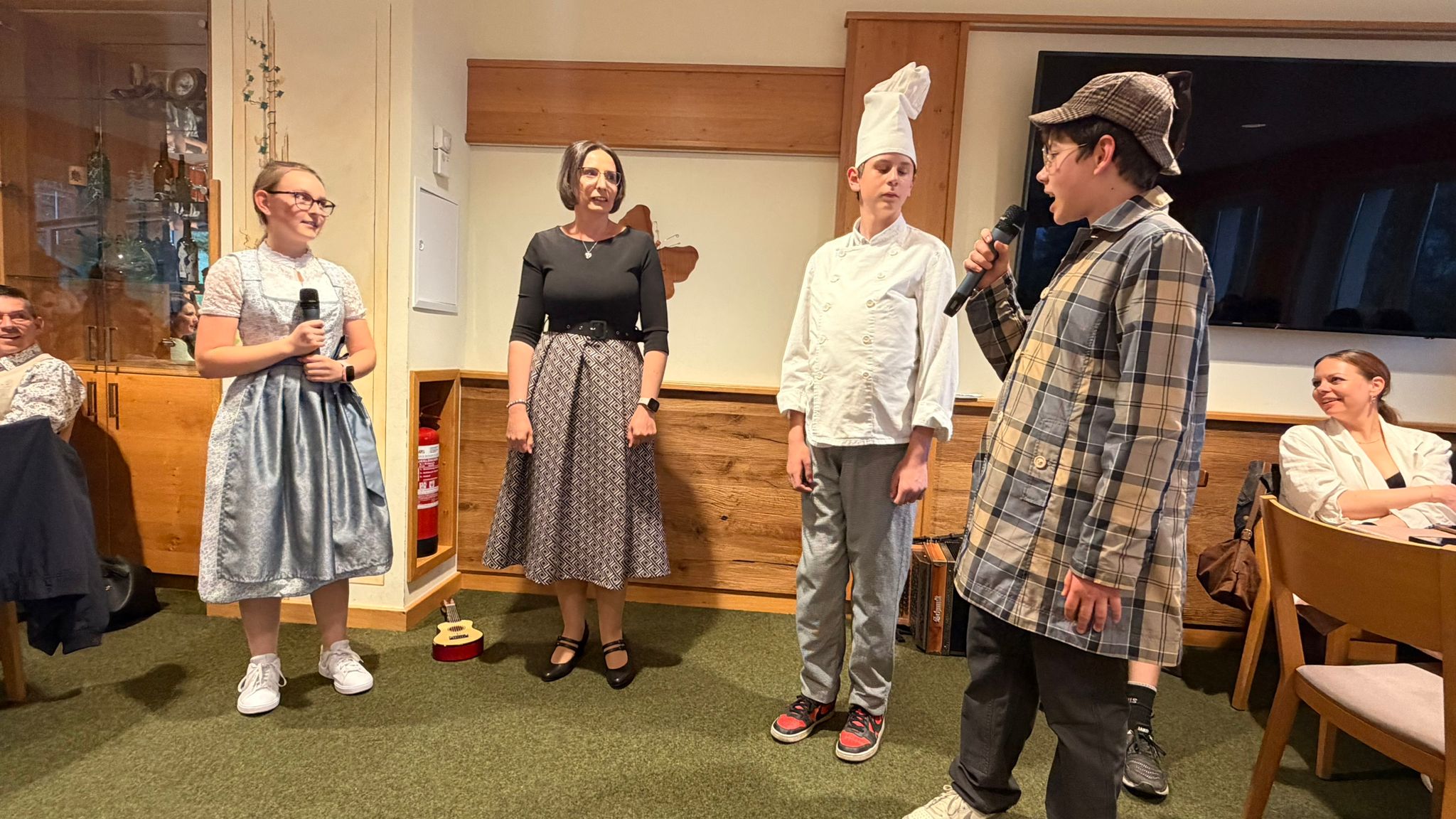 Zwischen den einzelnen Gängen sorgte ein inszeniertes Verbrechen für Nervenkitzel und beste Unterhaltung. Die Gäste wurden aktiv in die Ermittlungen einbezogen, bis schließlich Kommissar Finn den Fall lösen konnte. Zur Überraschung aller entpuppte sich Frau Fachlehrer Schützenhofer als Täterin.
